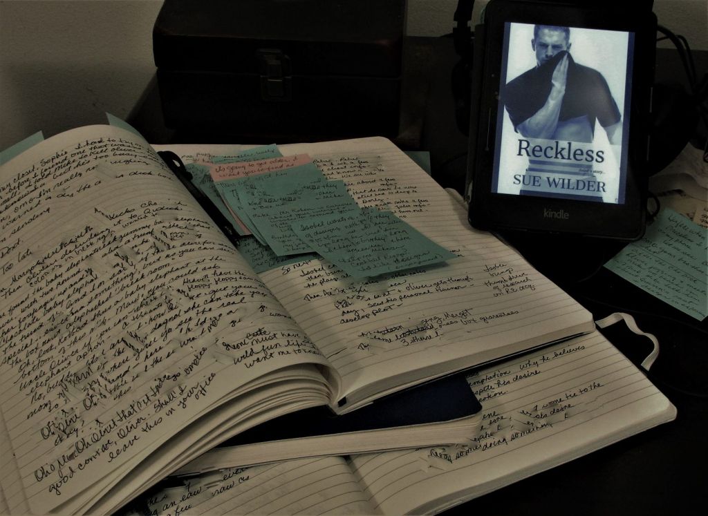 When I started writing, I used yellow legal pads, but that got too confusing. I found these books at Walmart, and I could buy different colors back then, which I liked. Different color for different book title. Easy to find the one I wanted. I used the white cover for general writing notes, but now they only come in black… so I may have to find a new Lucky Journal brand. Always a risk. Just like changing pens once you find your lucky pen.